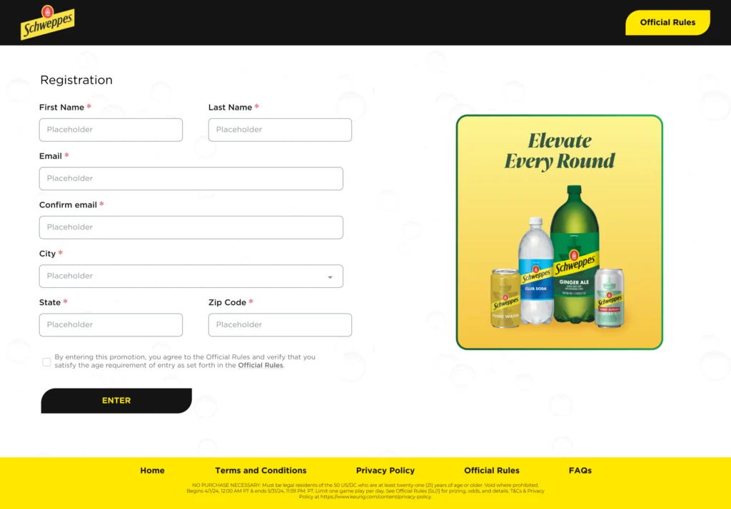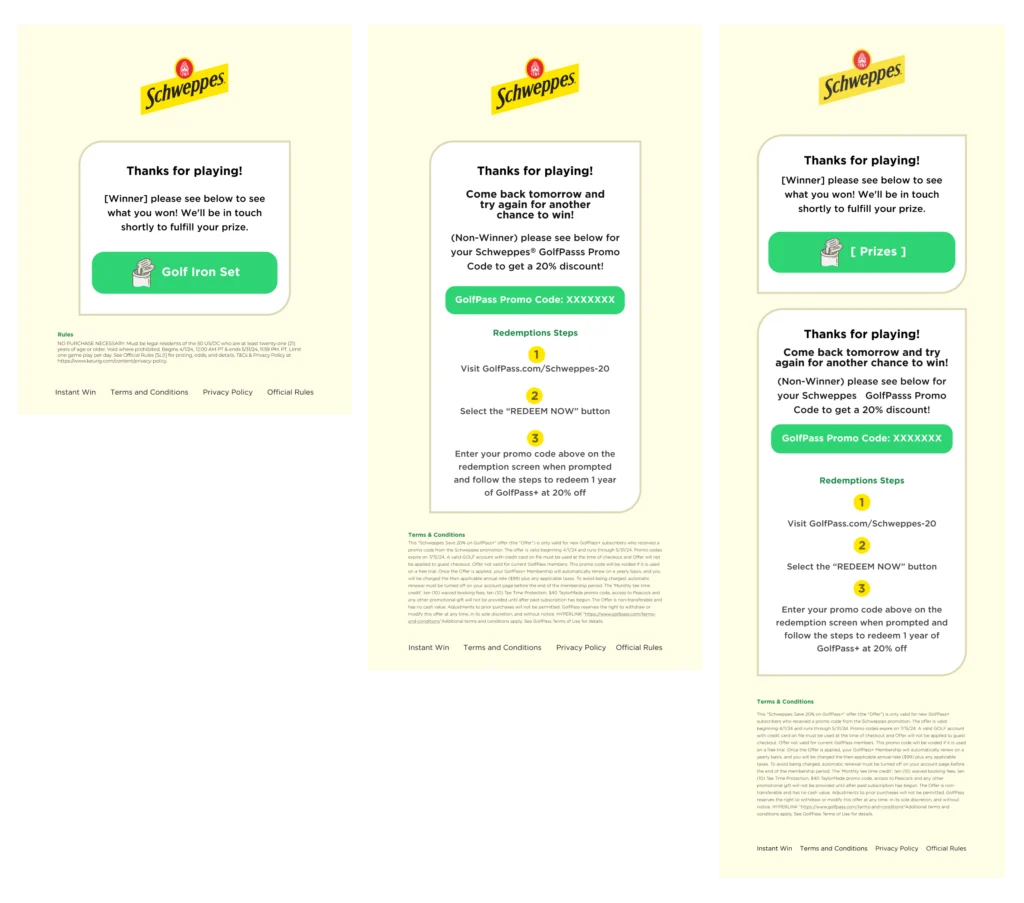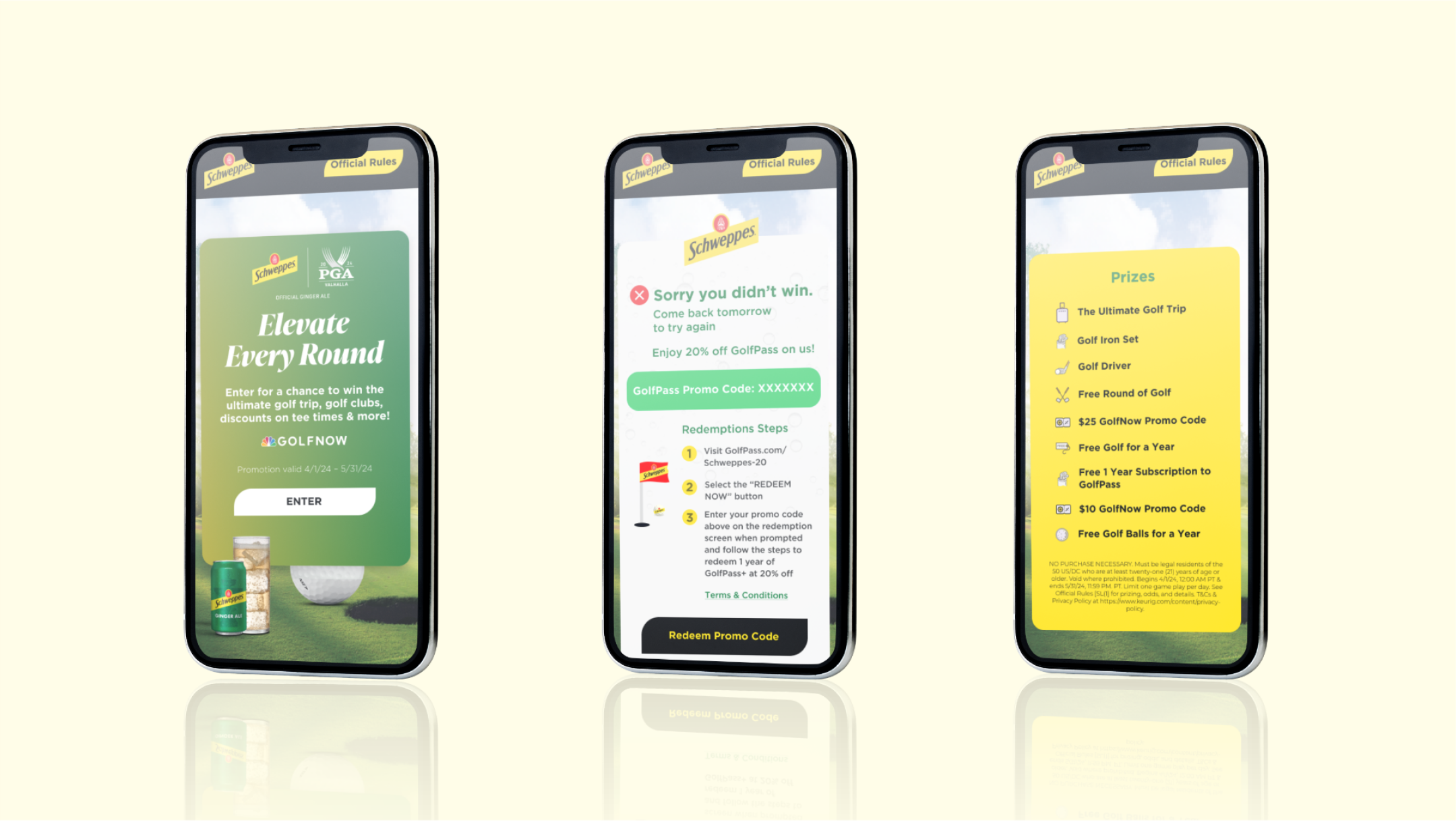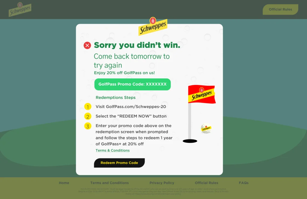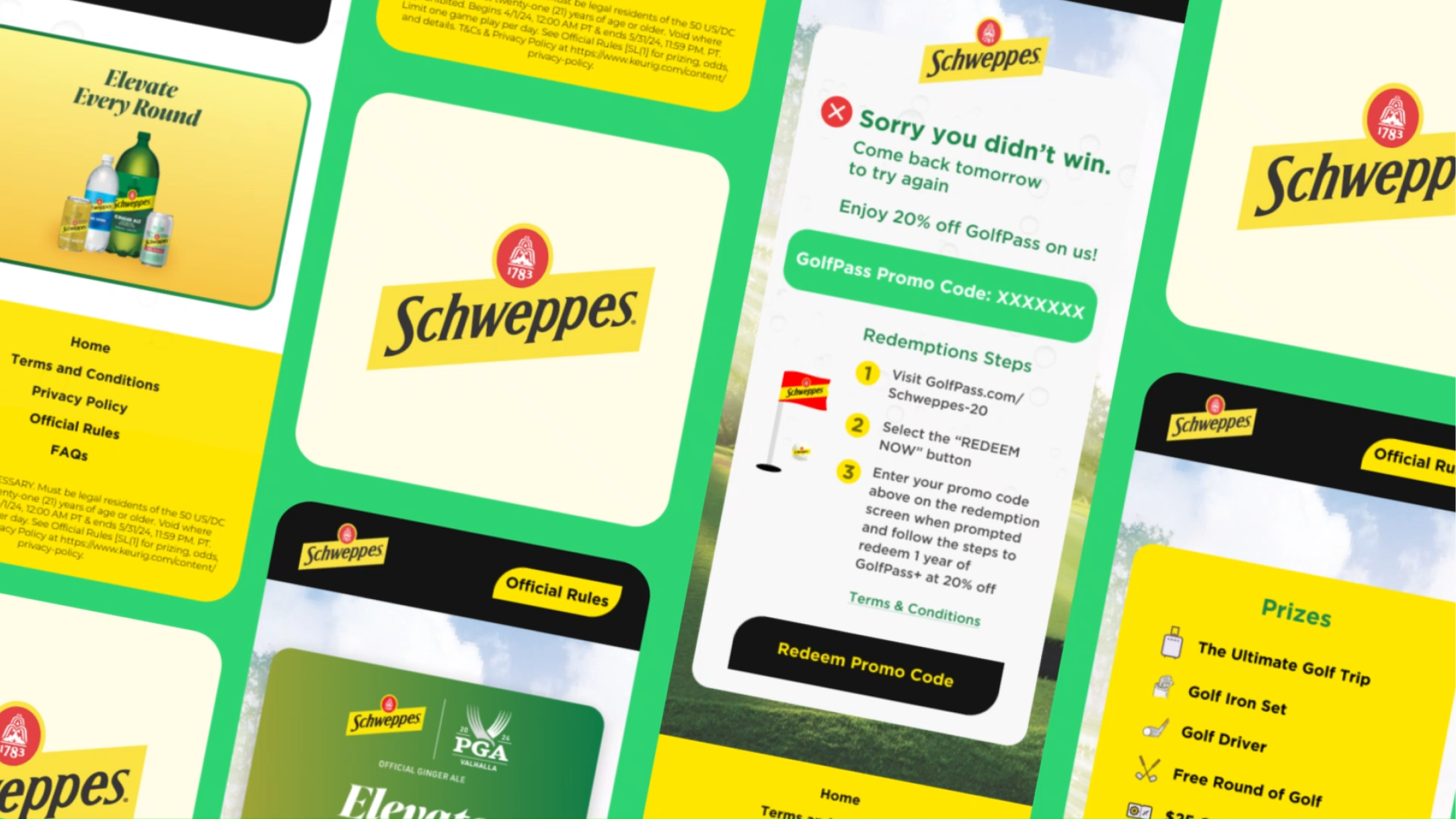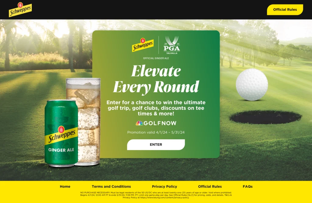 Se desarrolló una campaña digital basada en el universo del golf, bajo el concepto “Elevate Every Round”, donde Schweppes invitaba a los usuarios a jugar online en un sitio web gamificado. La experiencia permitía: